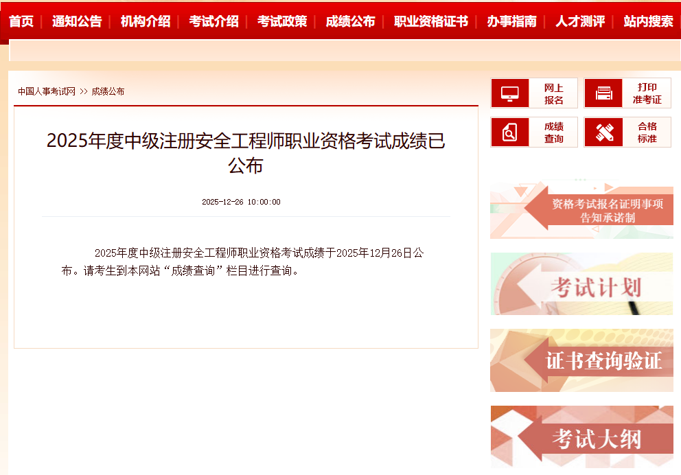 2025年度中级注册安全工程师职业资格考试成绩于2025年12月26日公布。请考生到中国人事考试网(www.cpta.com.cn)“成绩查询”栏目进行查询。